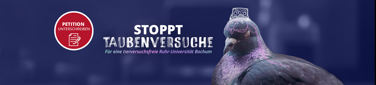 An der Ruhr-Universität Bochum (RUB) werden jedes Jahr tausende Tiere in Tierversuchen verwendet – darunter auch Tauben. Tauben werden durch Hunger oder Durst gezwungen, bestimmte Verhaltensweisen zu erlernen, und invasiven Eingriffen am Schädel und Gehirn ausgesetzt. Ihnen werden Löcher in den Schädel gebohrt und Substanzen ins Gehirn injiziert. Und wofür? Aus reiner Neugier und für einen weiteren Artikel in einer Fachzeitschrift. Der Nutzen dieser Versuche für den Menschen ist gleich null, da sich Vogelgehirne grundlegend von denen des Menschen unterscheiden. Aber auch mehr als 12.000 Mäuse, Ratten, Fische und andere Vogelarten leiden jährlich an der RUB unter Tierversuchen.