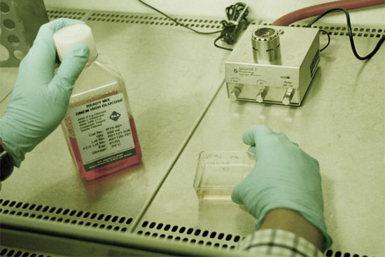 Drops of culture media and growing cells are pipetted into a Petri dish.